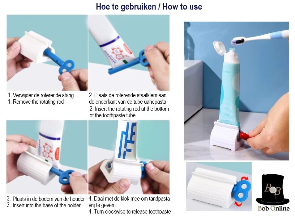 Waar wacht je nog op? Bestel nu de Bob Online™ handmatig tandpastadispenser en geniet van optimaal bebruiksgemak!