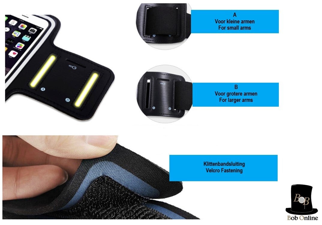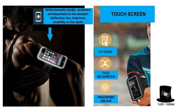 Are you looking for a practical and comfortable sports arm band for running, cycling or walking? Discover the Bob Online™ universal sports armband now! This adjustable mobile phone arm band is waterproof and has a touchscreen phone holder, suitable for iPhone, Samsung, Xiaomi and Huawei up to 16,5 cm. With its fluorescent edge you also remain clearly visible in the dark. What are you waiting for? Order now and enjoy comfort and convenience during your sporting activities!
