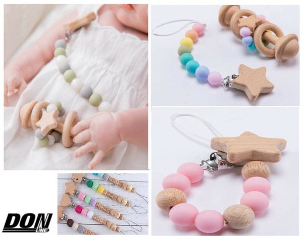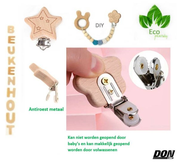 Deze schatige houten fopseenklemmen zijn gemaakt van hoogwaardig natuurlijke Beukenhout, roestvrij metaal, smaakloos en milieuvriendelijk. Ze zijn makkelijk te bevestigen aan de bijtring, speeltjes en andere babyaccessoires of kleding, spoegdoekje, kinderwagen en autogordels.