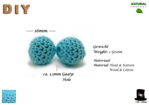 16mm Ronde Gehaakte Houten Kralen - Licht Blauw - 10 Stuks