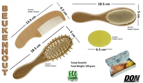 De enige babyborstelset & babyverzorgingskit die je nodig hebt – De DONLINE set bevat eersteklas zachte natuurlijke geitenhaarharen, een zachte ontwarrende borstel, een stevige houten kam en een GRATIS siliconen badshampooborstel om het haar van je baby voorzichtig te borstelen en zijn hoofdhuid een ontspannende massage te geven. Creër een dagelijks ritueel om een band met je baby te krijgen!.