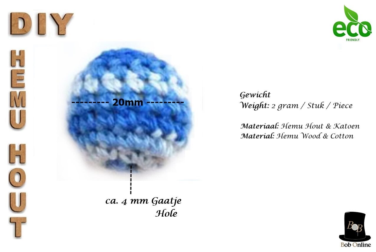 10 Stuks – Veelkleurig Blauw/Wit - 20mm Ronde Gehaakte Houten Kralen met ca. 4mm Gaatje