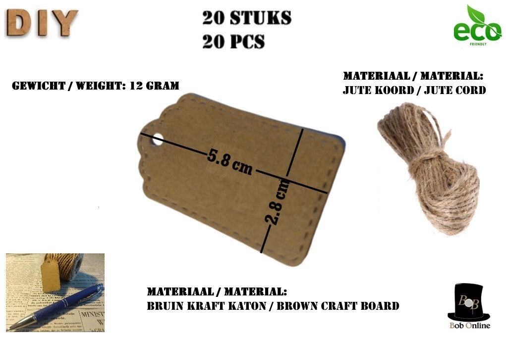 In uw pakket ontvangt u 20 stuks van ca. (L) 5.8 cm x (B) 2.8 cm met 20 stuks voorgesneden jute koord voor uw gemak.