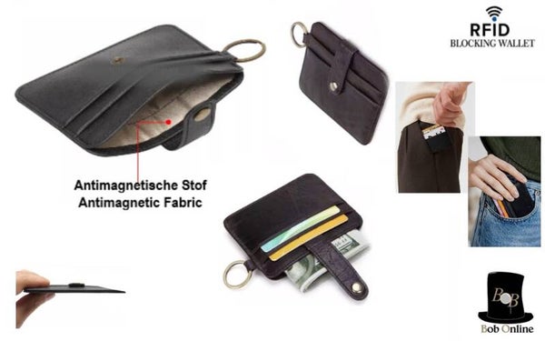 This stylish leather card holder from Bob Online ™, is equipped with an RFID blocking lining that reliably protects your electronic data from unauthorized scans by RFID/NFC readers. This slip wallet keeps all your important information safe while you are on the go.
