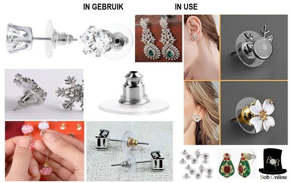 These Earring Stoppers from Bob Online ™, are made from soft silicone, latex-free and hypo-allergic. They can be used with fishhook earrings, hanging earrings and stud earrings and work well with heavy earrings.